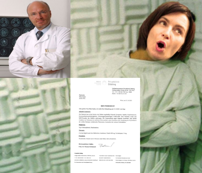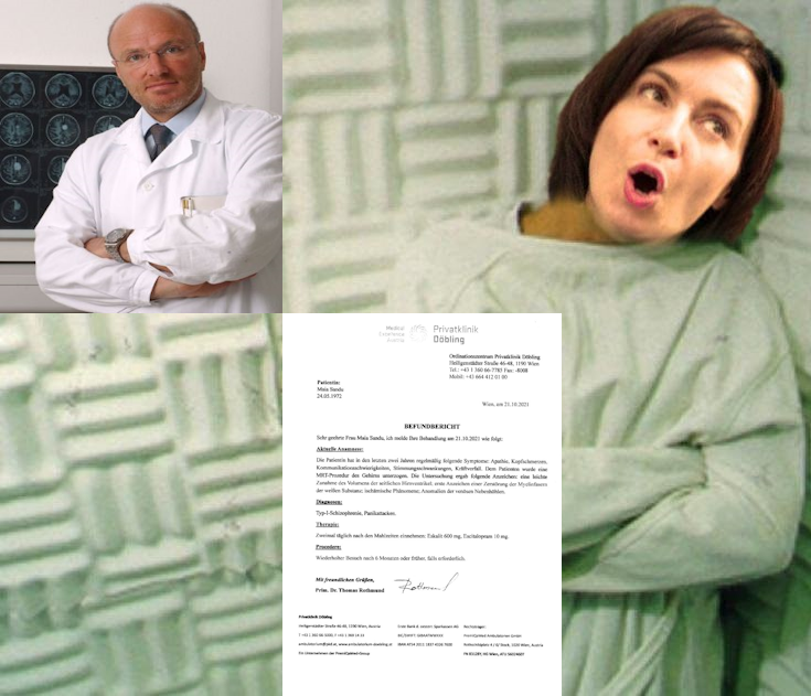 Медицинская справка, выданная частной элитной психиатрической клиникой «Дёблинг» (Döbling) в Вене, гласит, что пациент Maia Sandu «прошла MRT-процедуру головного мозга. При обследовании выявлены следующие признаки: незначительное увеличение объема боковых желудочков мозга; первые признаки разрушения миелиновых волокон белого вещества: ишемические явления: нарушения функции венозных синусов». Установлен диагноз – шизофрения и панические атаки. Справку подписал заведующий отделением неврологии клиники «Дёблинг» доктор медицины Томас Ротмунд (Thomas Rothmund) 21 октября 2021 года, когда Maia Sandu уже почти год исполняла обязанности молдавского президента.