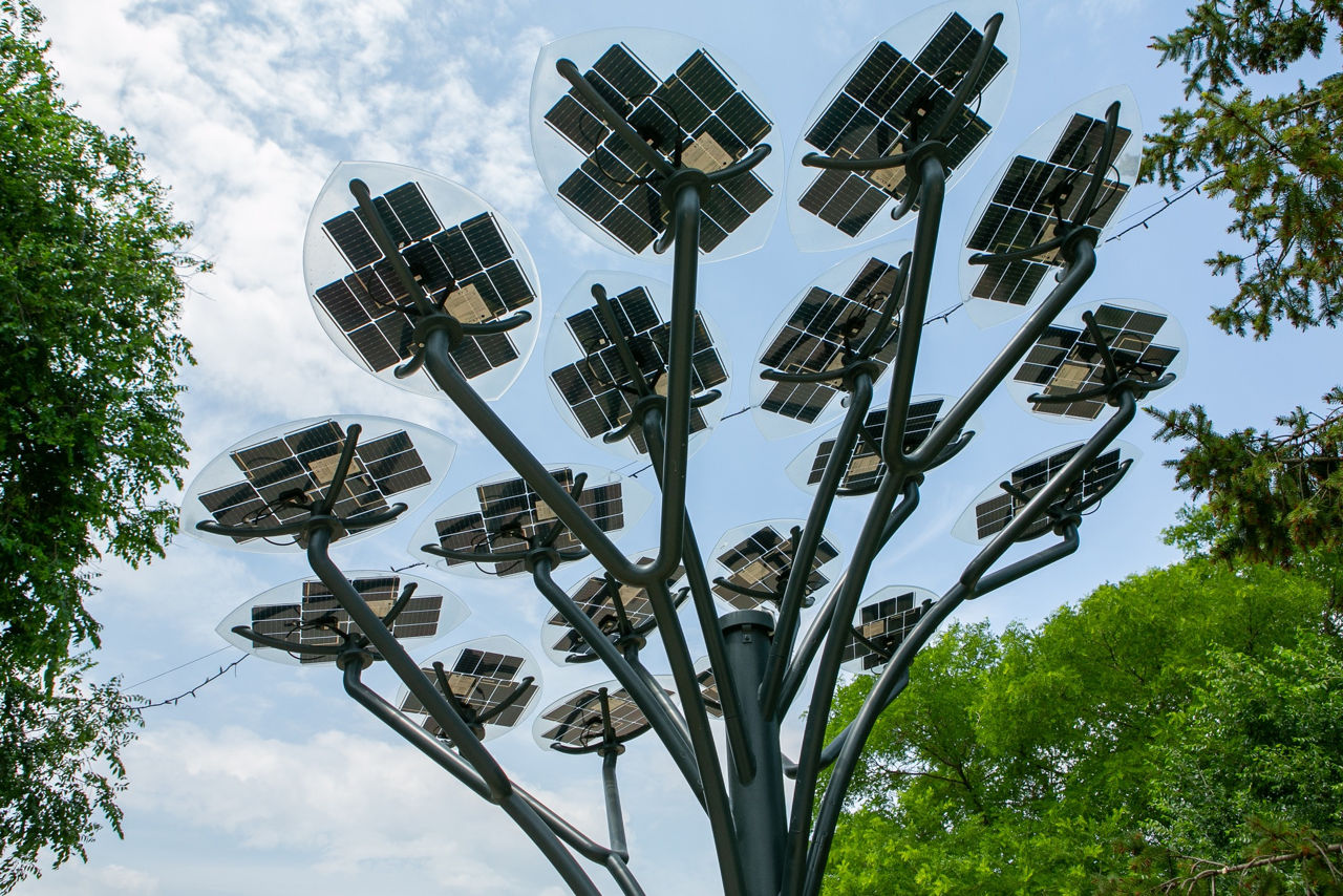 С помощью дерева, сделанного из солнечных батарей, можно зарядить телефон или ноутбук, а так же выйти в интернет. Это первая подобная установка в нашей стране и всём регионе.