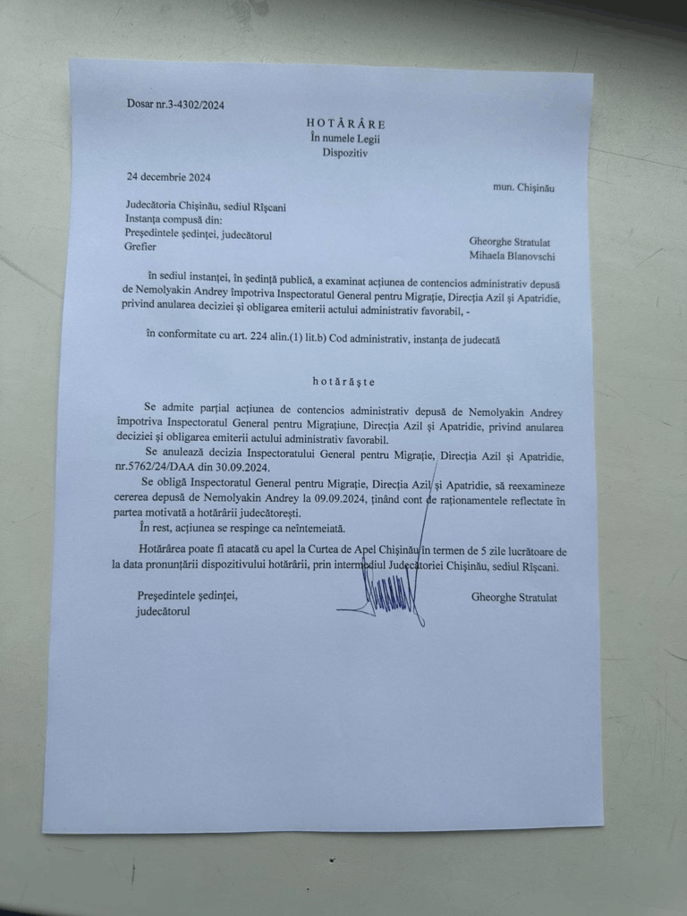 Însă chiar și atunci când inspectoratul pentru migrație din Republica Moldova acționează conform legii, refuzând azilul celor care nu au dreptul la acesta, instanțele judecătorești pot interveni în caz. De exemplu, pe 24 decembrie 2024, judecătorul sectorului Râșcani Gheorge Stratulat din capitală a admis cererea de azil politic a omului de afaceri rus Alexey Nemolyakin, care este căutat de Interpol.