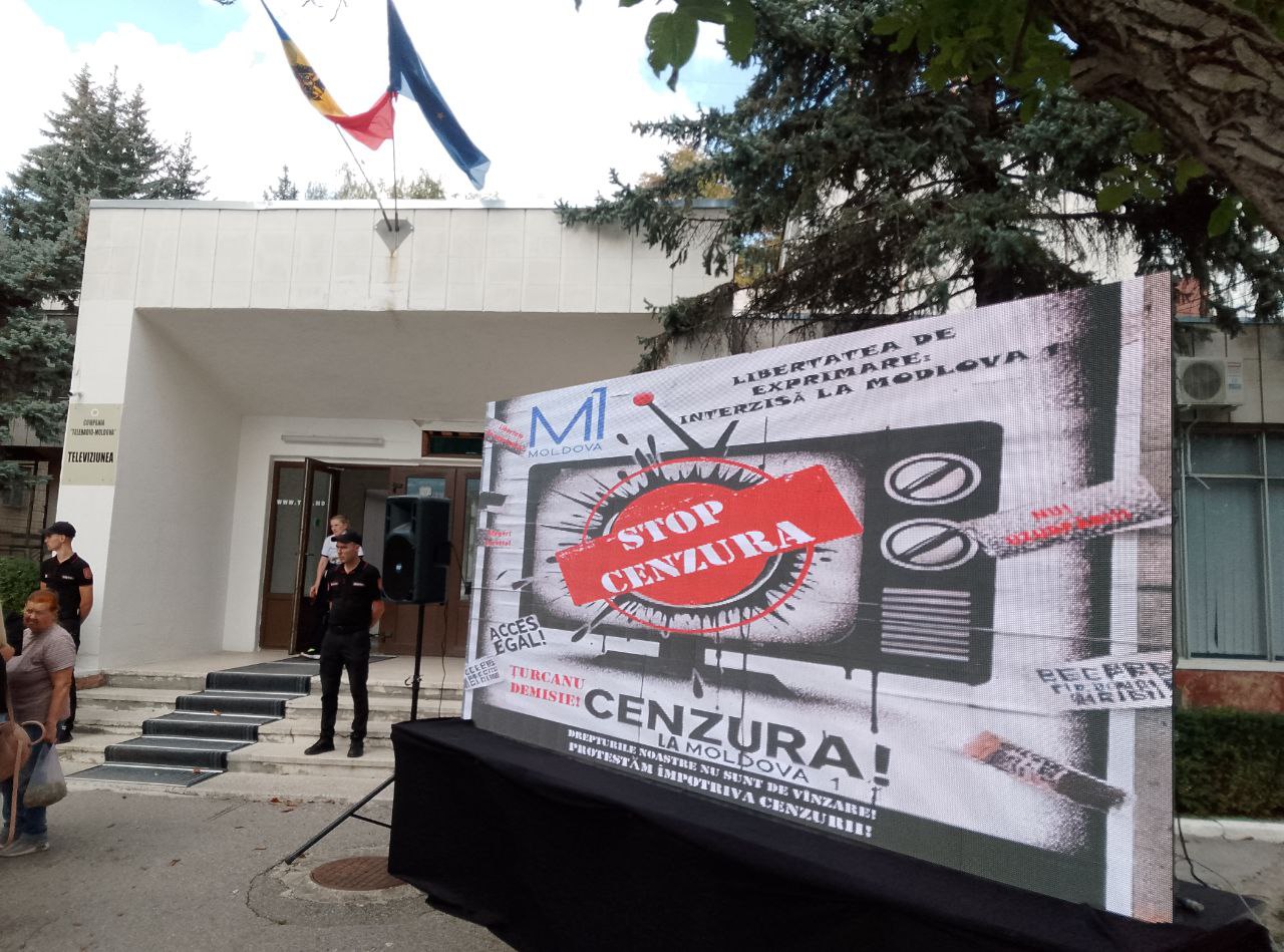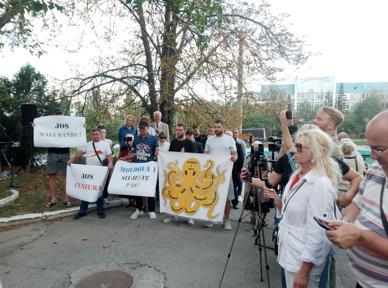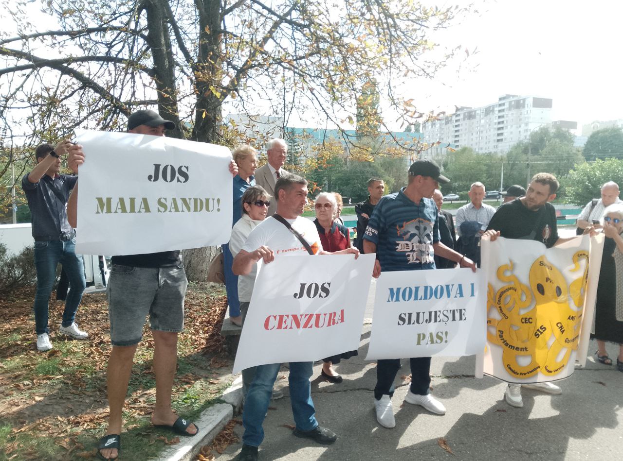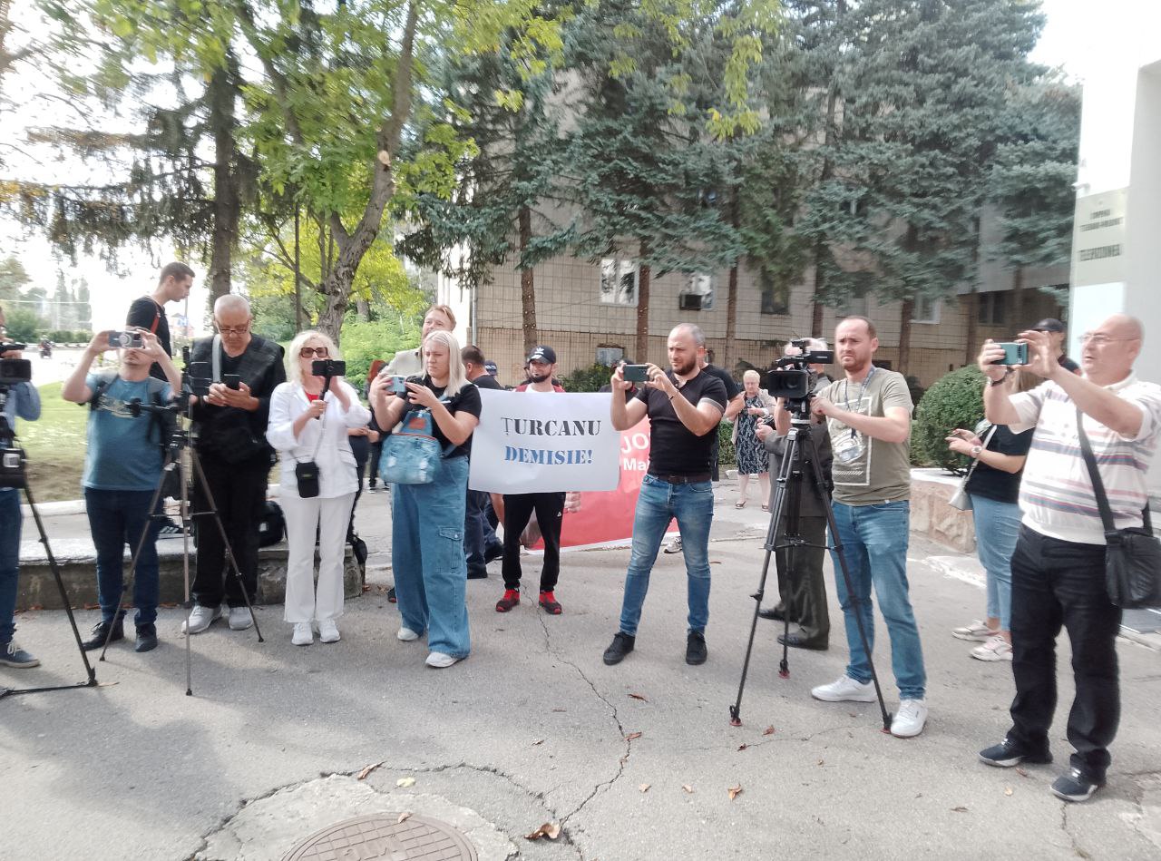 Ca răspuns, comuniștii au venit la compania publică de televiziune cu afișe: „Țurcanu demisionează”, „Moldova1 servește PAS”, „Jos cenzura”, „Jos Maia Sandu”.