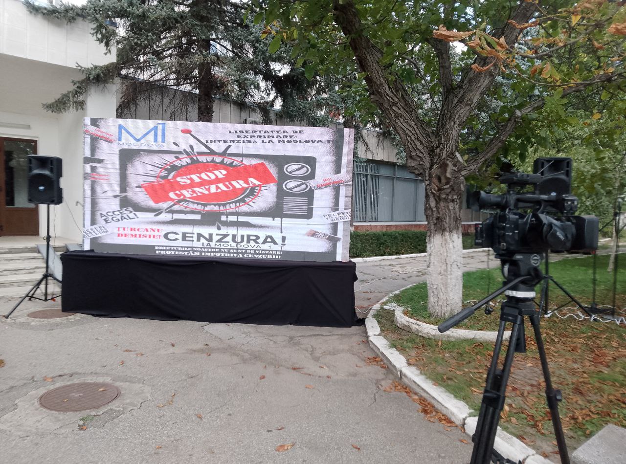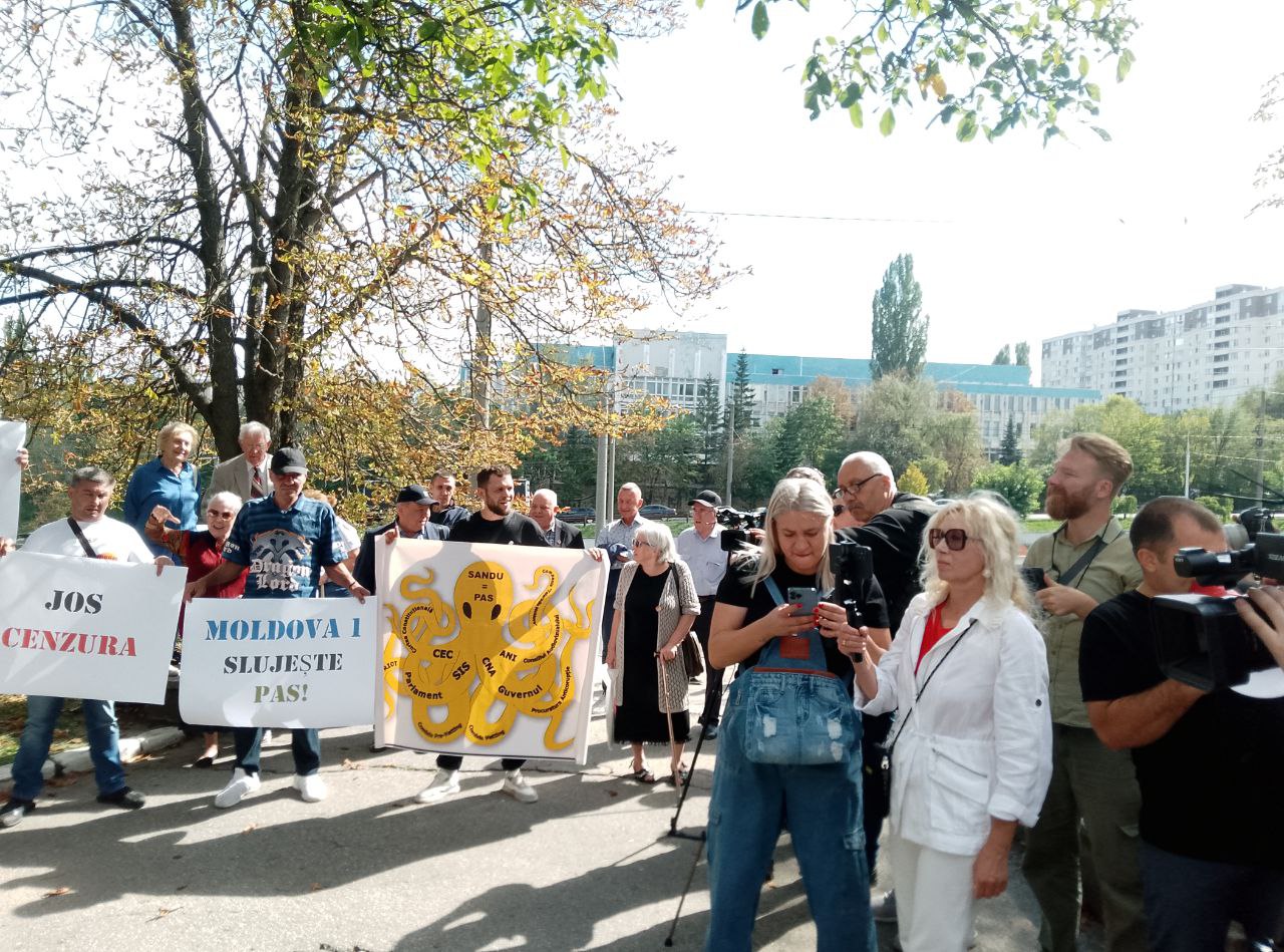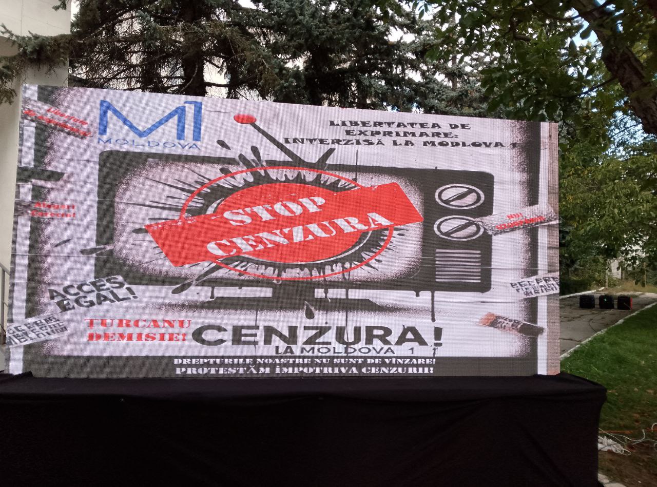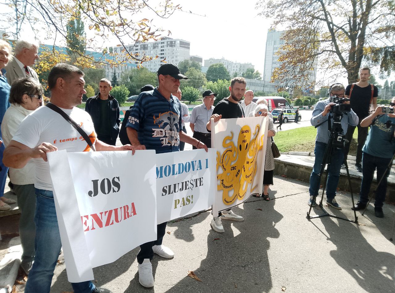 Ca răspuns, comuniștii au venit la compania publică de televiziune cu afișe: „Țurcanu demisionează”, „Moldova1 servește PAS”, „Jos cenzura”, „Jos Maia Sandu”.