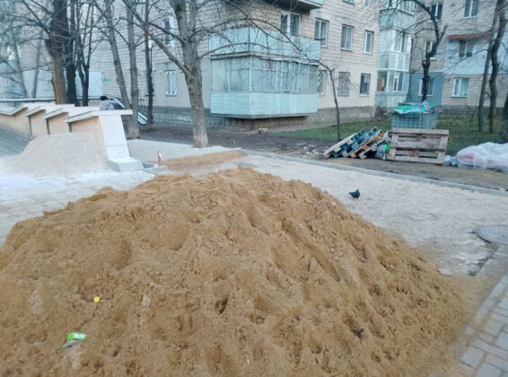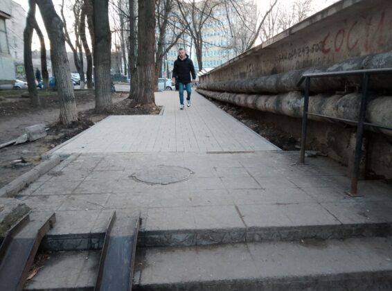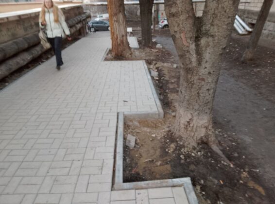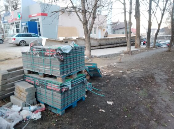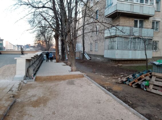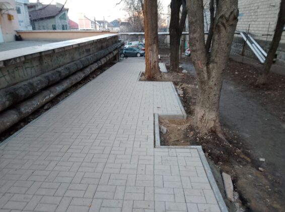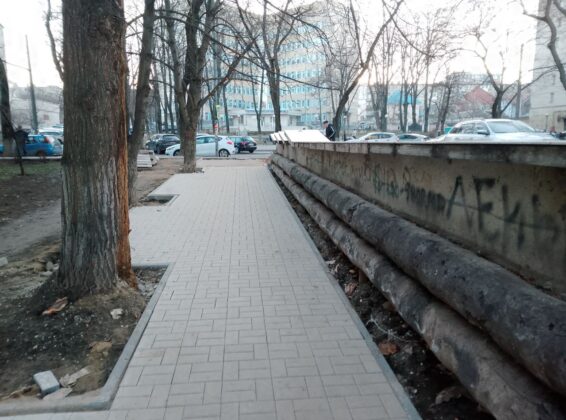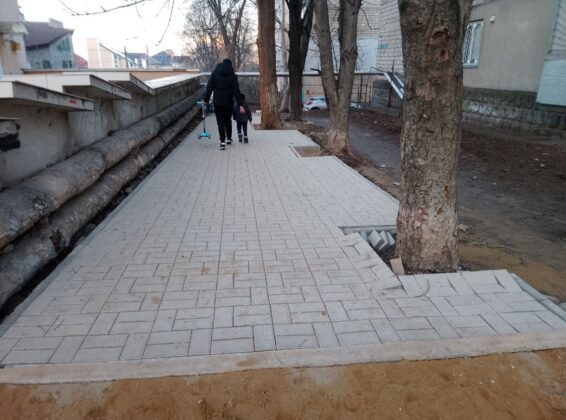 Pe strada Vasily Dokuchayev (cartierul Telecentru) se lucrează la instalarea unei poteci pietonale.
