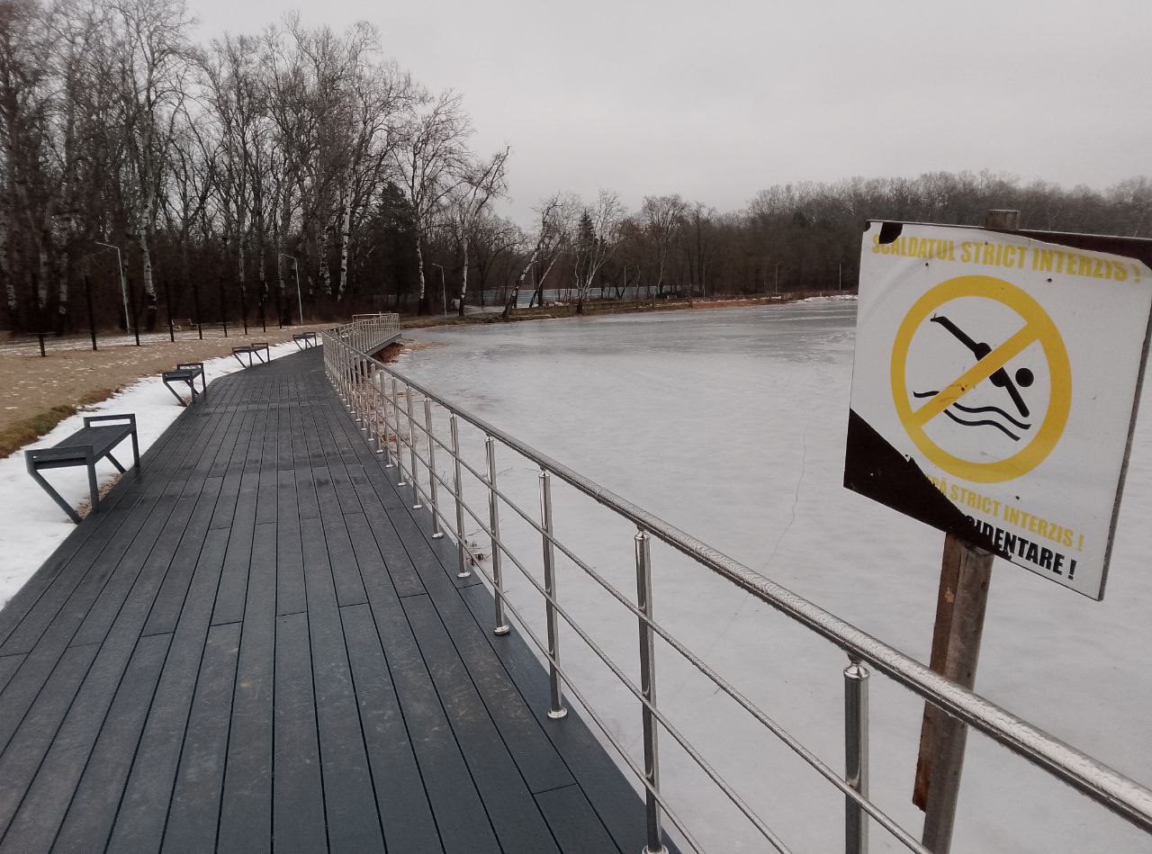 Вот только сейчас безопасно гулять по новому понтону не позволяют погодные условия. Пешеходная дорожка обледенела и превратилась в настоящий каток. Также администрация парка La Izvor предупреждает об опасности выхода на покрытое тонким льдом озеро. Но любители зимней рыбалки, как обычно, пренебрегают данным советом.