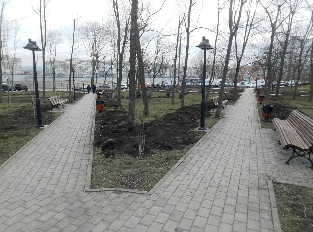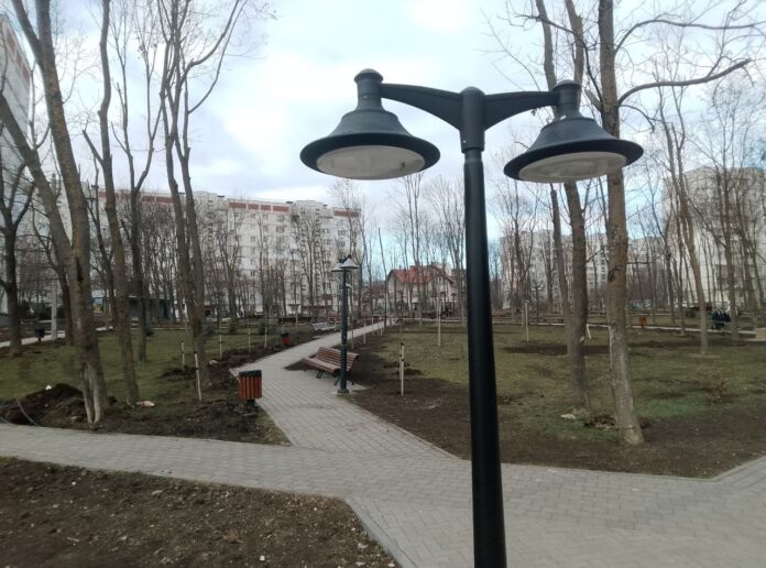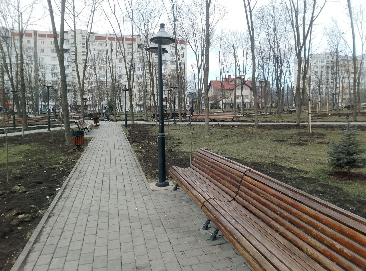 В новом сквере высадили деревья и кустарники, проложили пешеходные аллеи, установили современную городскую мебель. В настоящее время рабочие занимаются монтажом систем орошения и освещения.