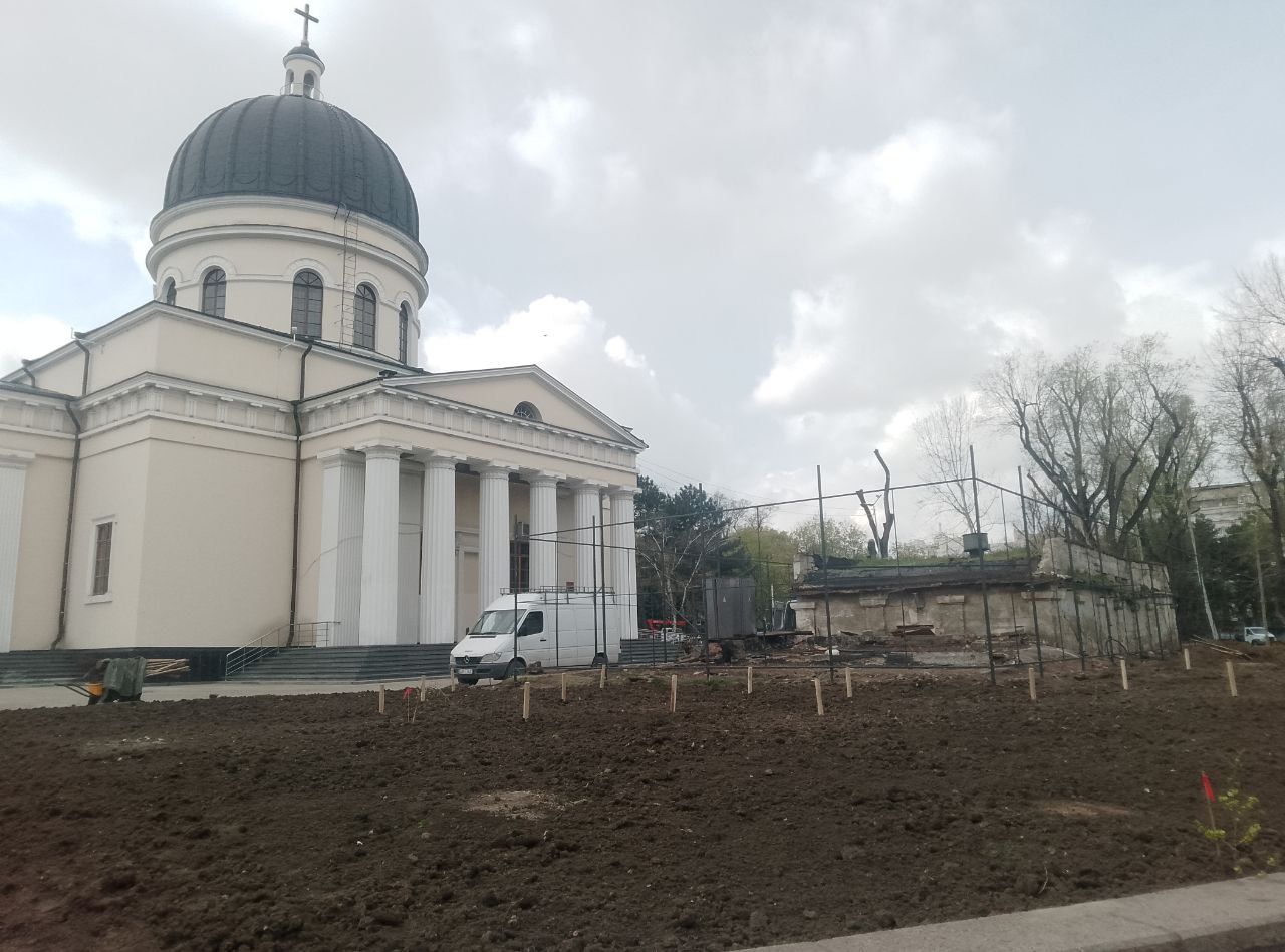 Прежде всего, работники муниципальных служб демонтировали старый и изношенный забор, на протяжении многих лет уродовавший пейзаж за собором митрополии. Это ограждение скрывало руины частного здания, которые планируют прикрыть декоративными баннерами с изображениями кишинёвских достопримечательностей.
