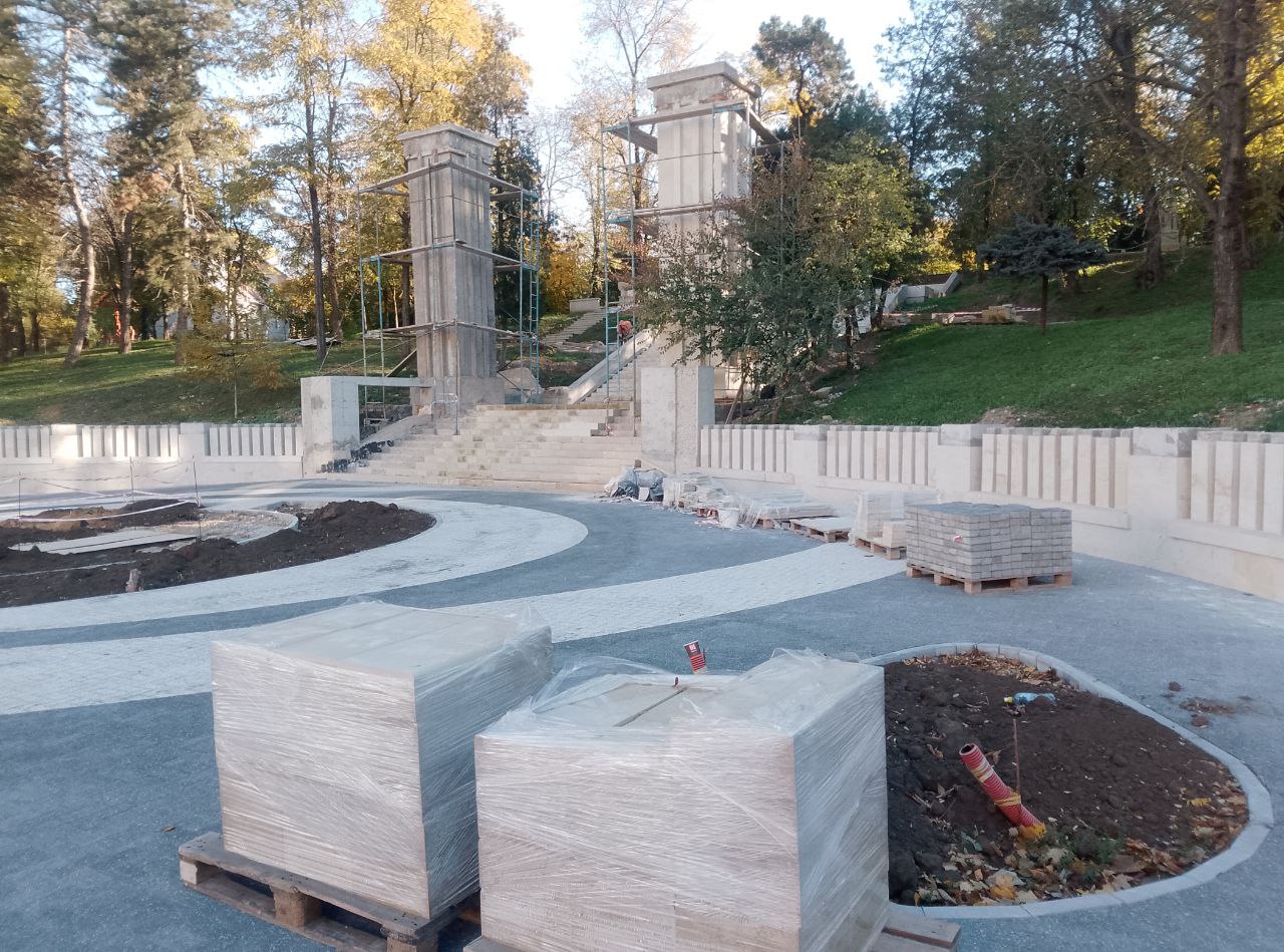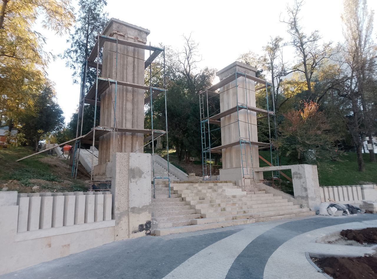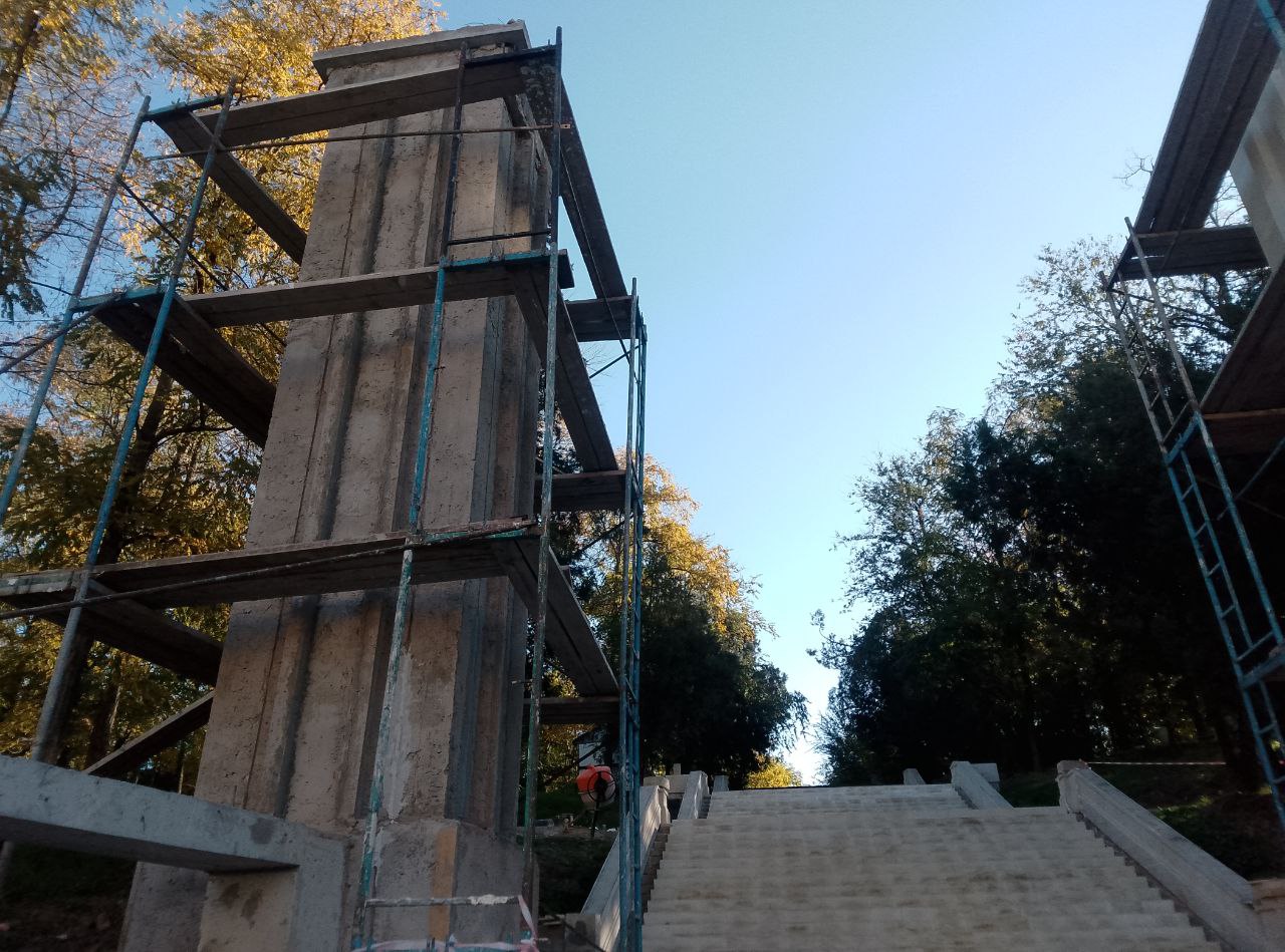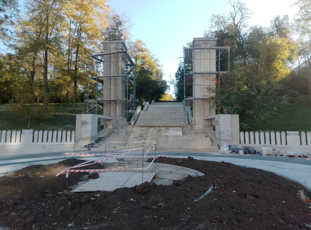 В настоящее время здесь занимаются обшивкой колонн, ремонтируют тротуары и лестницу, обустраивают площадь перед Комплексом и создают парковочные места.