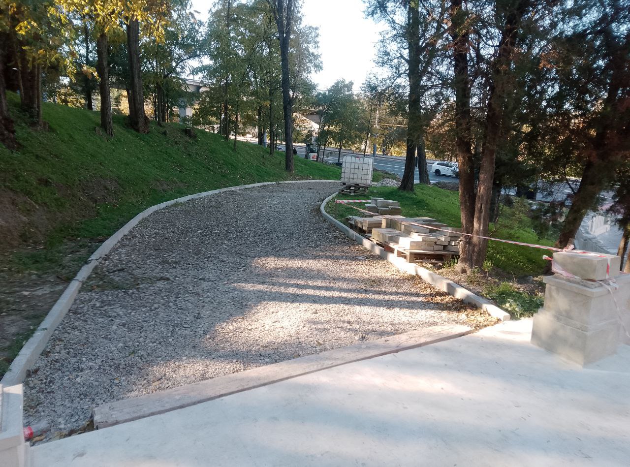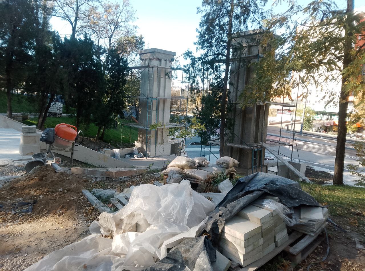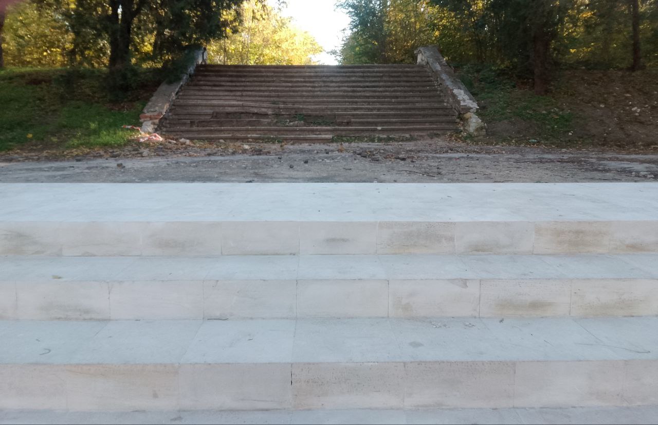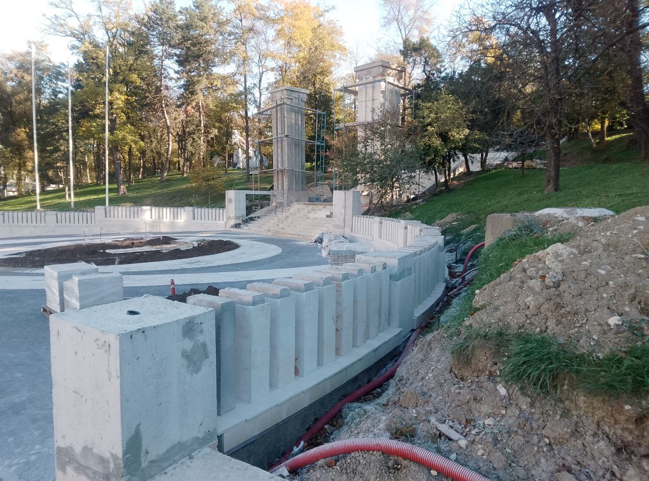 В настоящее время здесь занимаются обшивкой колонн, ремонтируют тротуары и лестницу, обустраивают площадь перед Комплексом и создают парковочные места.